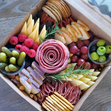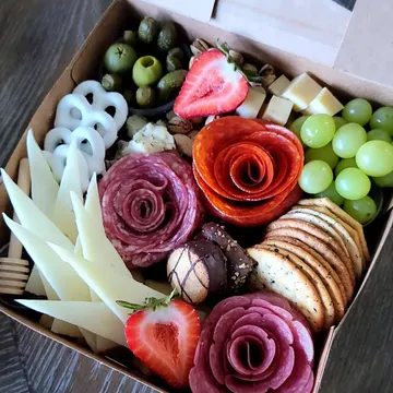 Grab some friends and lets have a picnic! Or how about game night? Perfect for couples night and small gatherings that like sharable appetizers with a variety. This item comes with an assortment of 3 cheeses, 2 charcuterie meats, artisan crackers, varying seasonal fresh and dried fruits, crudité's (assorted raw vegetables) and other accoutrements such as nuts, pickled vegetables, jams, preserves, honey, &/or sauces for dipping.